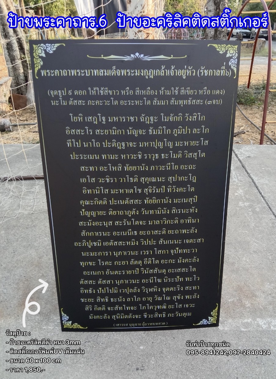 ป้ายอะคริลิคสีดำติดสติ๊กเกอร์พิมพ์UV ป้ายพระคาถา รัชกาลที่ 6